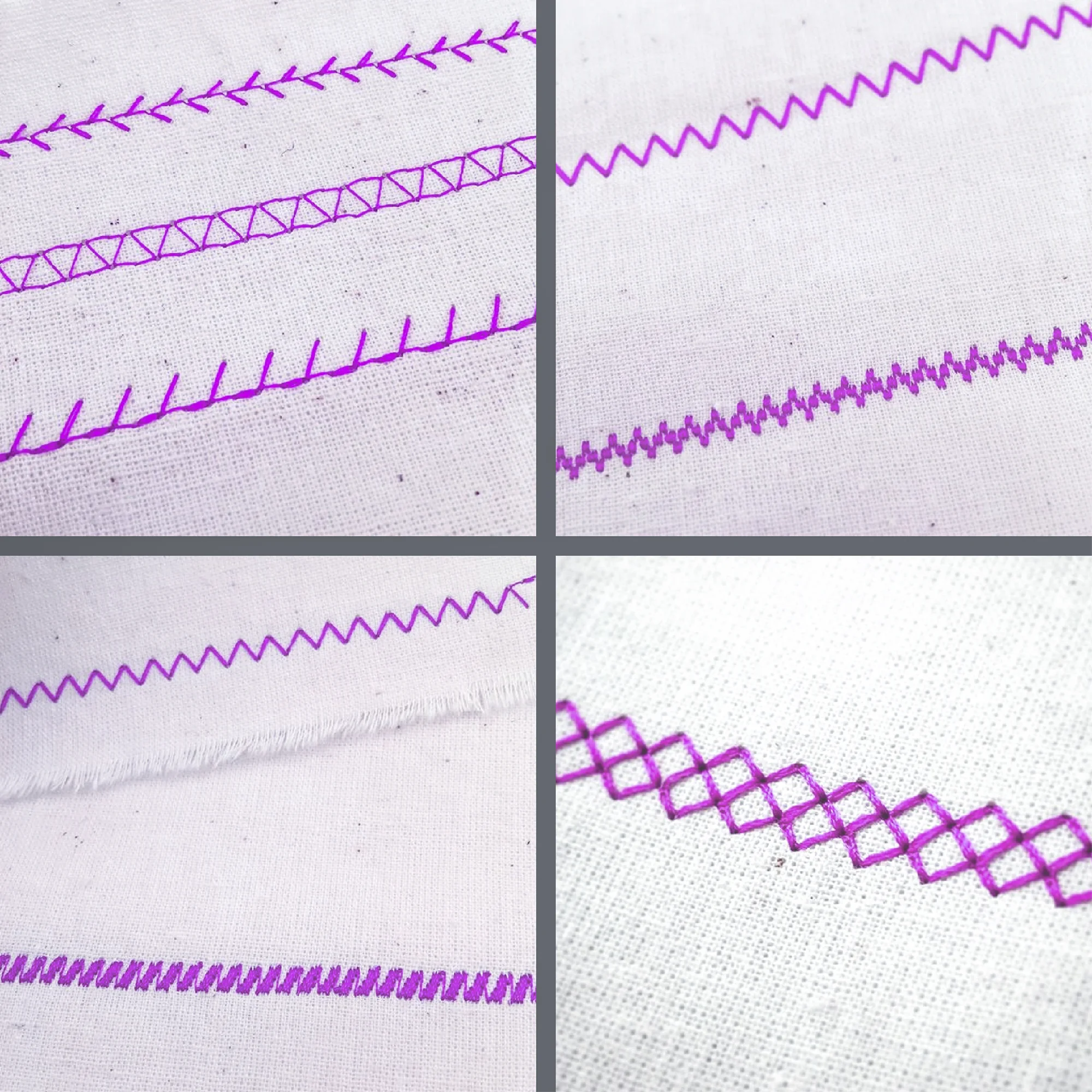 The EverSewn Maker 100 stitch package features 21 stitches including a 1-step buttonhole. The full stitch library is conveniently printed on the front of The Maker 100 machine, with the knob positioned directly below to select your stitch.